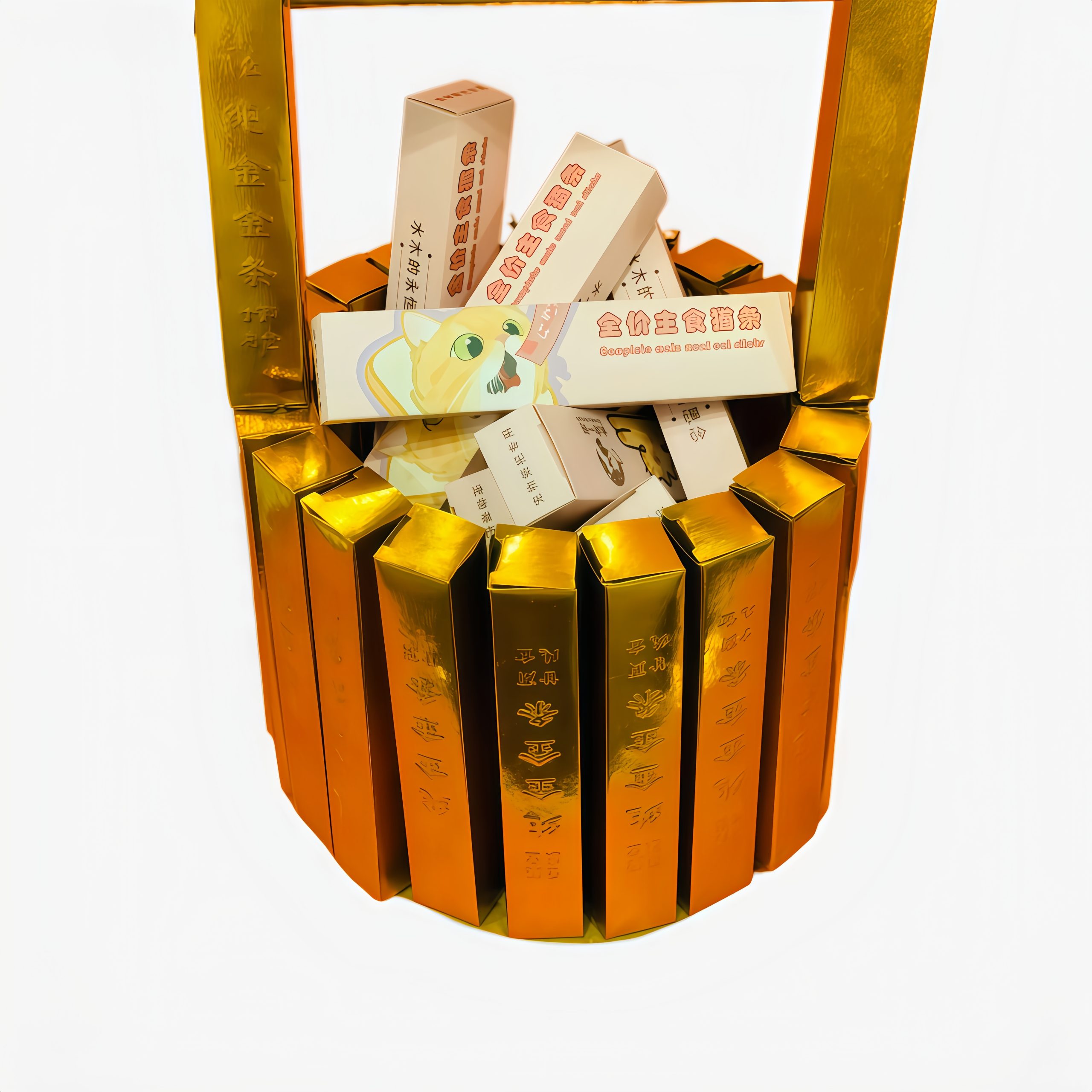 Cut from thick gold foil cardboard, restoring the exquisite shape of a gold bucket with paper cat strips inside. Following the traditional Chinese custom of burning paper for pet funerals, the cardboard is golden and burns completely. A paper offering designed for cat funerals, symbolizing sending snack reserves to the deceased cat to ensure it has plenty of delicious food.